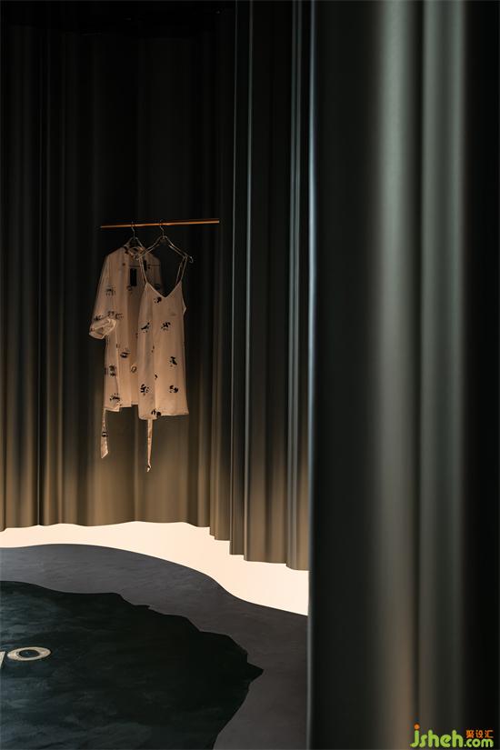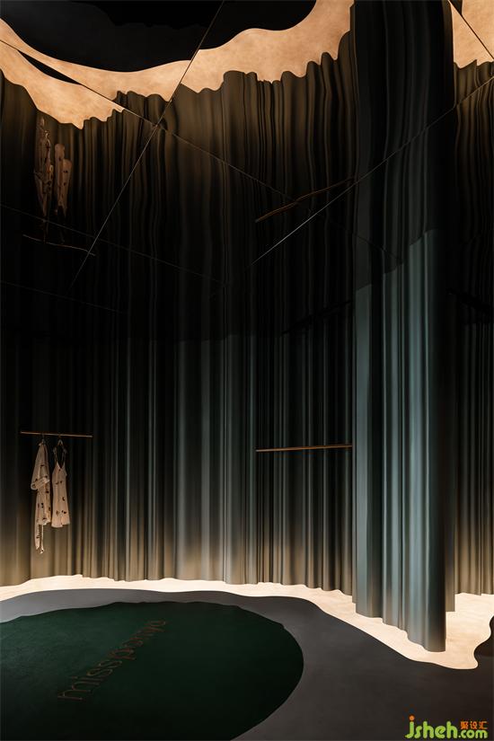 空間選用品牌的基本色墨綠色作為背景基調(diào),如瀑布般傾瀉而下的墨綠色隔墻,辦公室設(shè)計以絲綢漆模仿真絲內(nèi)衣質(zhì)感,拉開了空間的戲劇帷幕,垂墜下綠色華美流光,在地上漾起星河漣漪,自由無拘,蔓延流轉(zhuǎn)。