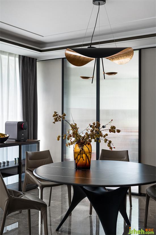 理性的折線樓梯搭配垂墜的透明吊燈,和諧之余,別墅設(shè)計(jì)也將空間勾勒得更富肌理感。