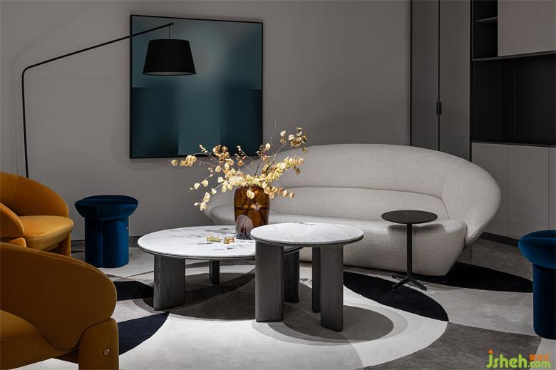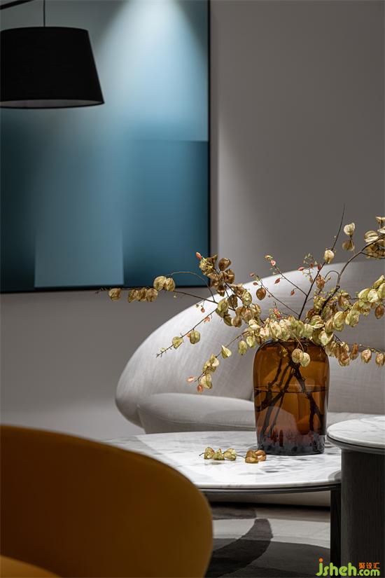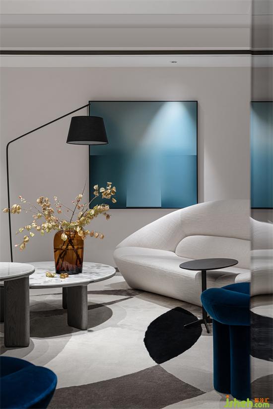 一抹沉靜的藍(lán)色作為空間中的調(diào)色,給人以視覺沖擊,在和諧的節(jié)律中,將待客氛圍烘托得恰到好處。