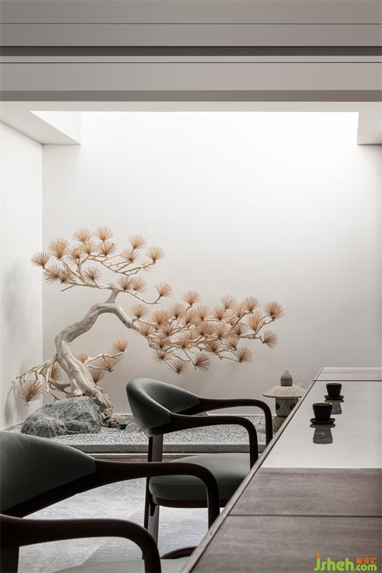 典雅的茶室線條干凈利落,別具韻味??萆剿囊饩碃I(yíng)造,禪意十足,同時(shí)又與空間的自然主題一脈相承。