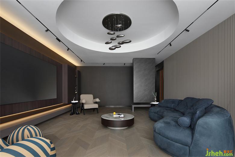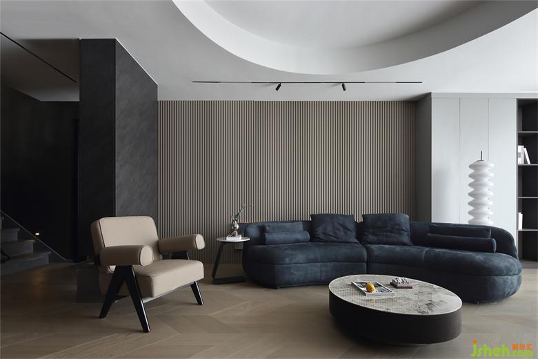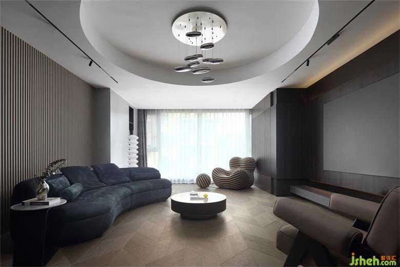 深藍色的弧形沙發(fā)營造出溫馨的圍合感,保證了坐感的舒適度,滿足朋友相聚時的圍坐暢聊。