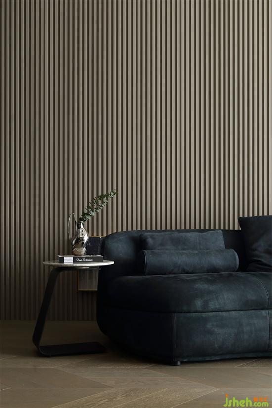 木質材質中和了酷黑的冷感,為空間注入些許溫潤氣度。家裝設計豎向紋理設計,將空間的視覺層次變得更為豐富。