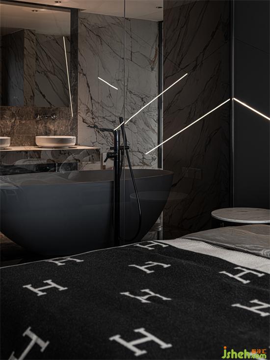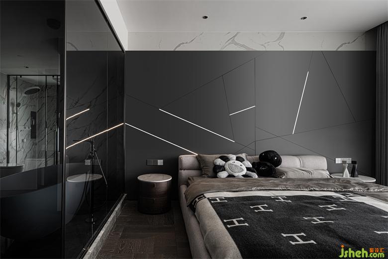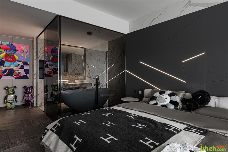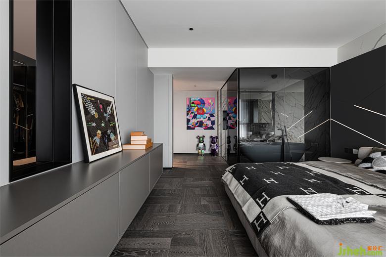 設(shè)計(jì)師在對(duì)原有空間進(jìn)行合理改造之后,得到了一個(gè)完整的主臥套房。家裝設(shè)計(jì)主臥以黑灰色為主色調(diào),突顯酷黑典雅的格調(diào),沉穩(wěn)靜謐,利于睡眠。裝飾別具個(gè)性的潮玩手辦與版畫,俏皮活潑,趣味性十足。