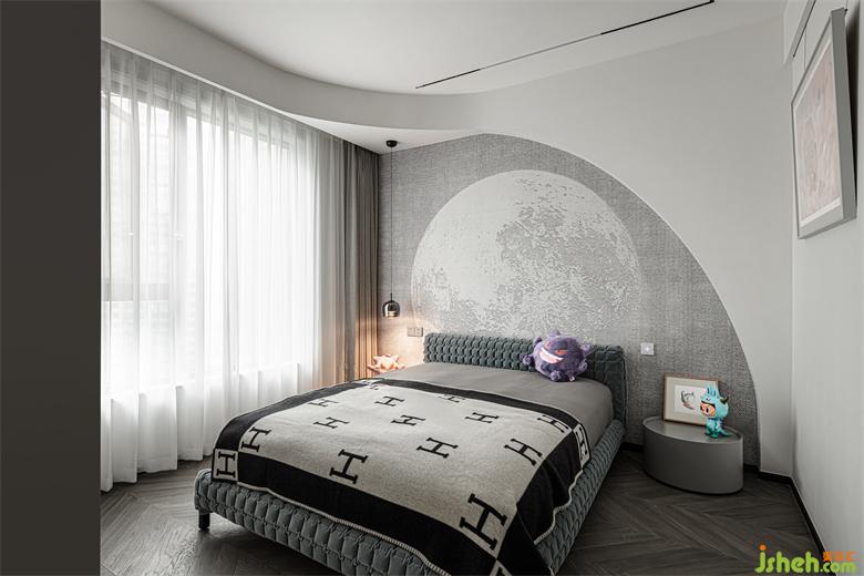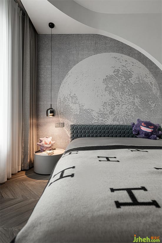 次臥以柔靜的灰色為主色調(diào),干凈舒適,不事雕琢,卡通玩偶點(diǎn)綴其間,增添俏皮的趣味之感。