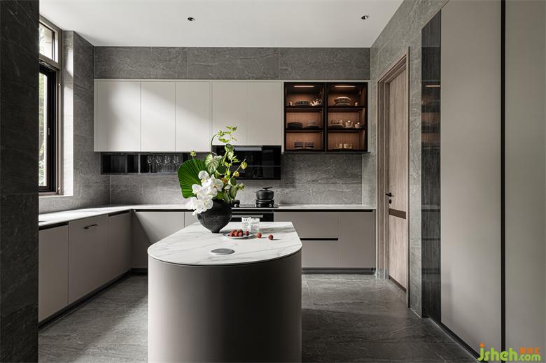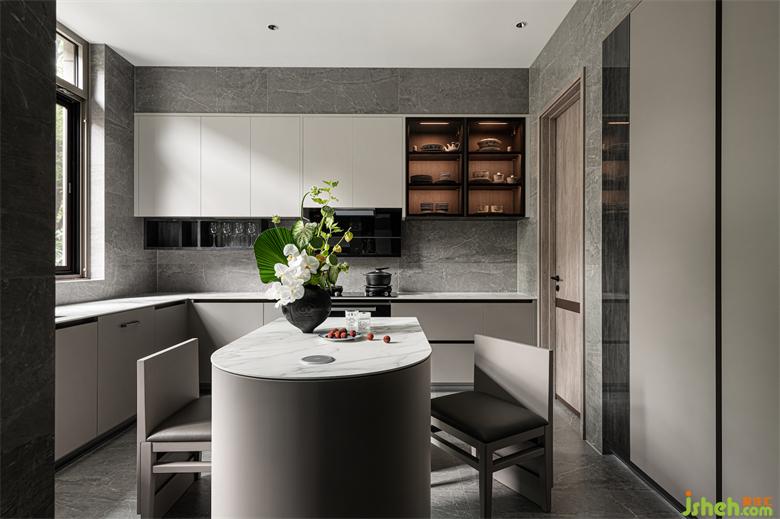 夫婦二人對廚房有著自己的理解,根據(jù)自身多年的生活習(xí)慣和生活經(jīng)驗,他們很少到外面吃飯,并不喜歡偏于形式化的西廚,而鐘愛于大氣開闊、實用性更強(qiáng)的中廚。為了滿足夫婦對廚房的高要求,設(shè)計師將原有的狹小空間予以拓寬,做了大氣寬敞的中廚。別墅設(shè)計大玻璃窗設(shè)計,讓廚房擁有著良好的通風(fēng)與采光。中間的島臺平時可以作為一張小餐桌,滿足四人日常的家庭用餐。