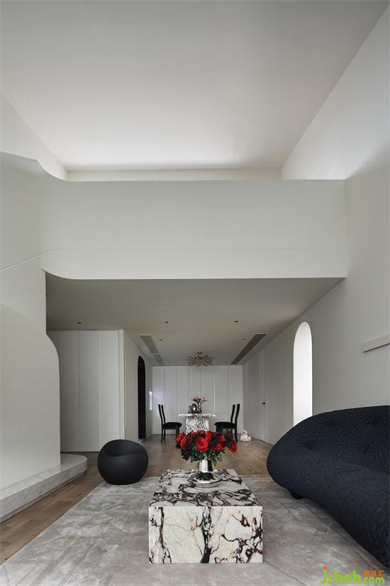 空間以白色作為主色調(diào),成都風(fēng)華苑復(fù)式裝修設(shè)計利用柔美的弧線做串聯(lián),勾勒出空間優(yōu)雅柔和的一面。選取深色沙發(fā),作為視覺的焦點,在用色上趨于簡單與平衡。