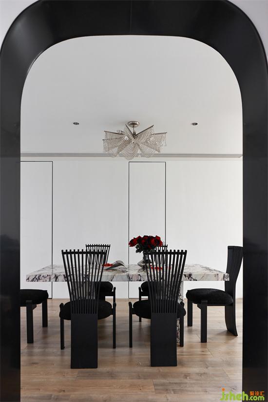 餐廳延續(xù)空間的弧形元素,利用弧形門洞造型營造儀式感,同時增加了整個空間在視覺上的縱深感。
