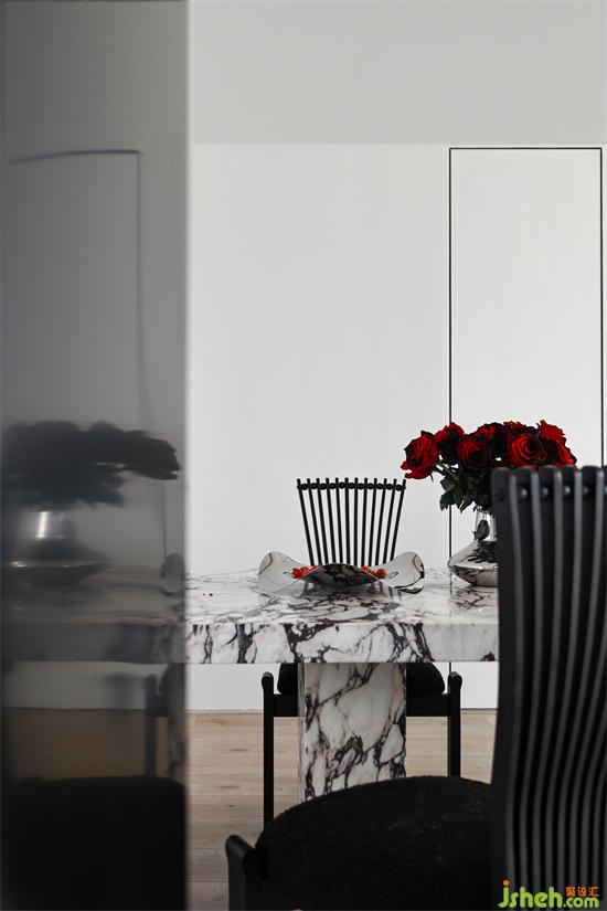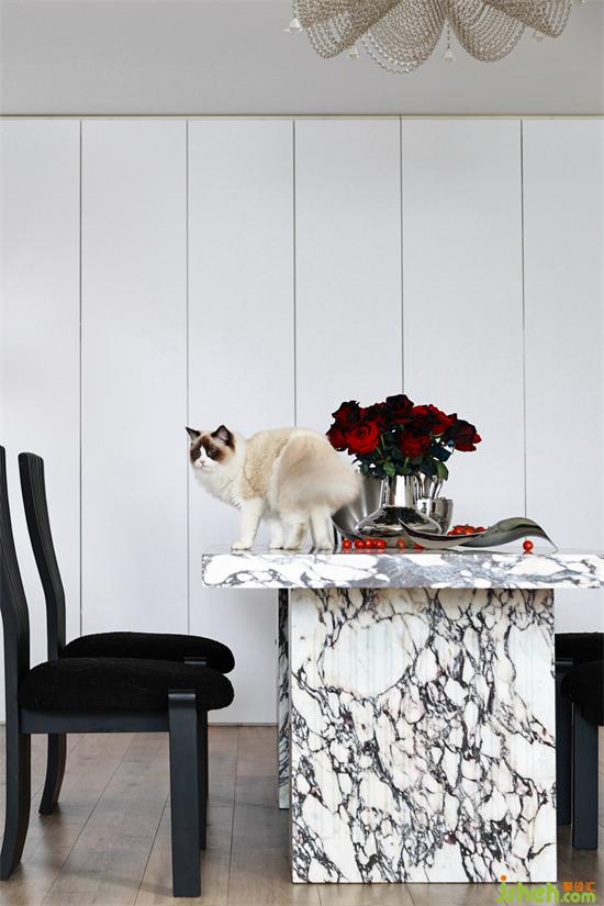 瓶盞之中插滿美艷的紅玫瑰,為空間增添一絲熱情與生機,活潑的貓咪也來湊熱鬧,跳上餐桌,瞪著好奇的眼睛興致勃勃地觀察著周圍的一切。