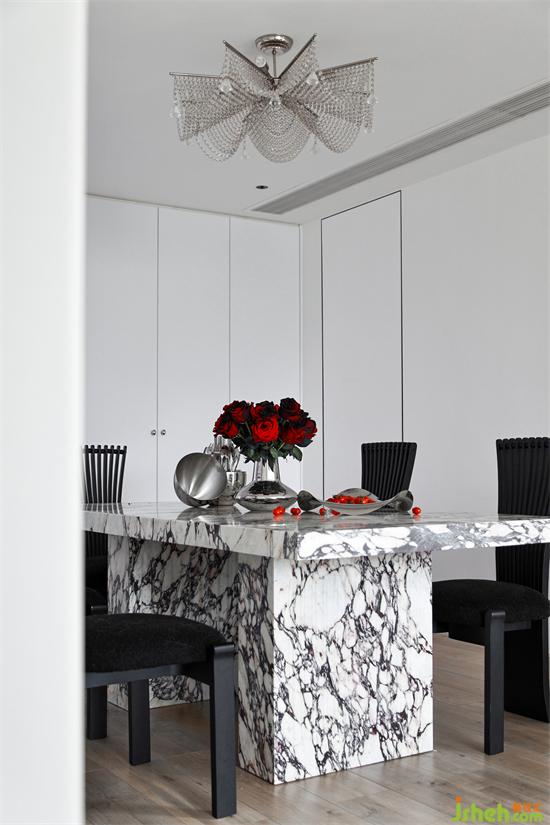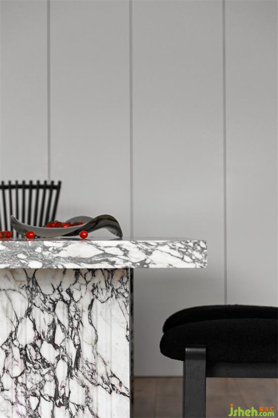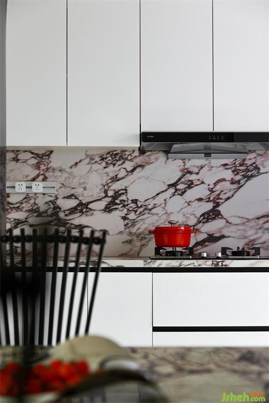 廚餐廳使用的理石紋路磚與客廳一樣,體現(xiàn)出整個空間的連貫性與流暢感。