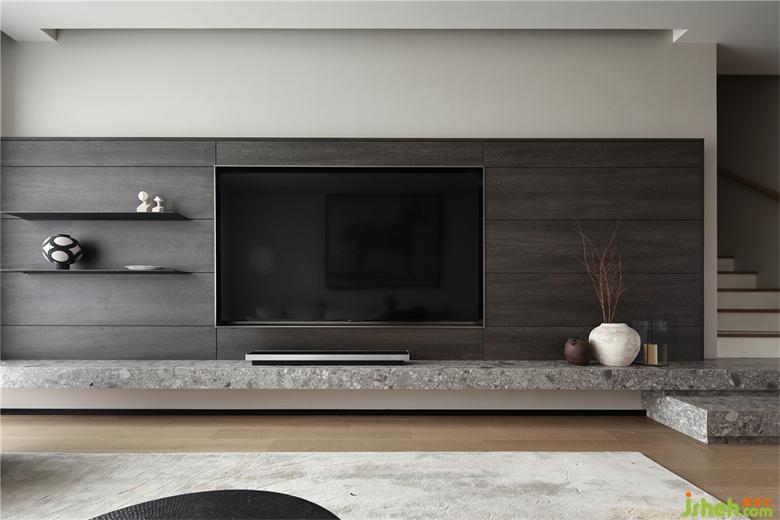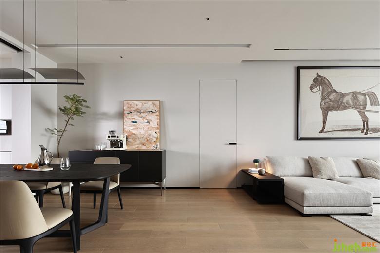 餐邊柜上的藝術(shù)版畫(huà)用斑駁的橙色為空間帶了一抹亮色,活潑生動(dòng),麓湖蕓臺(tái)漫躍層裝修設(shè)計(jì)中和了原有黑白空間的嚴(yán)肅感。隱形門(mén)的設(shè)置,讓整個(gè)空間看上去更加整潔干凈。