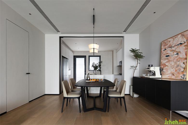 選用深色木質(zhì)餐桌,質(zhì)感十足,餐桌椅纖細(xì)的造型中和了深色帶來(lái)的沉悶感,麓湖蕓臺(tái)漫躍層裝修設(shè)計(jì)使整體空間不至過(guò)于沉悶。