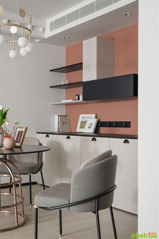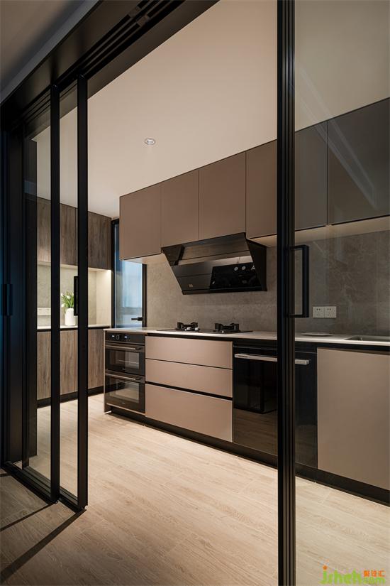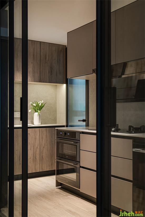 廚房的線條簡練,理性勾勒出整個空間的輪廓,深灰色的灶具選取別具質(zhì)感,整個空間干凈之余又有著簡約分明的秩序。