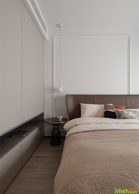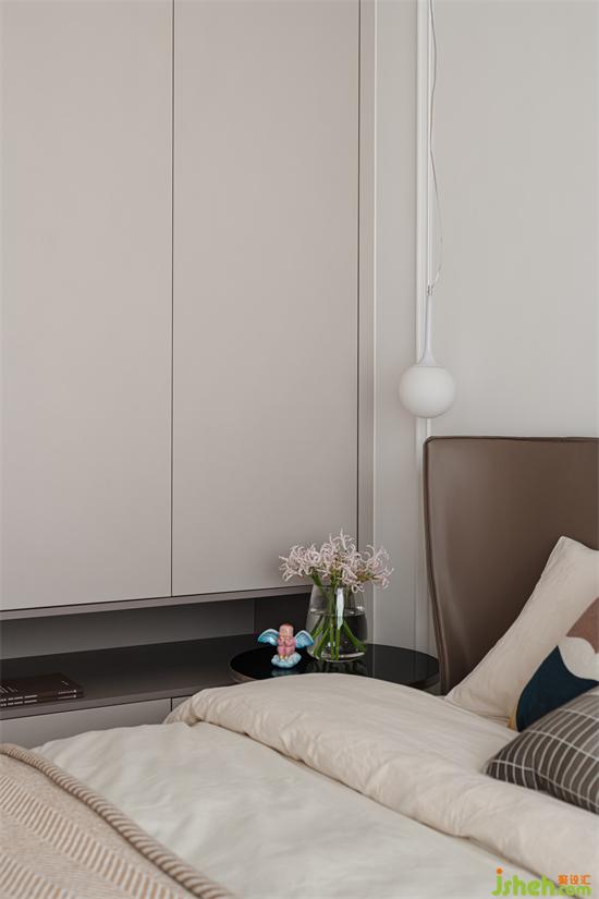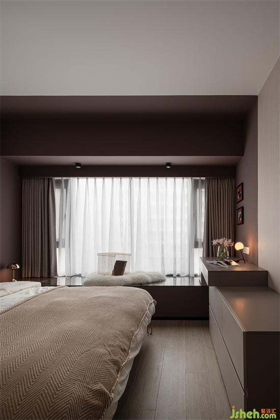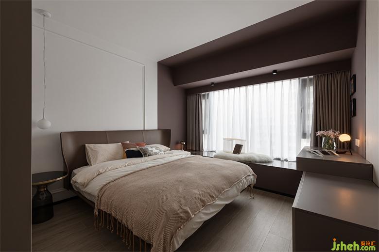 主臥鋪有木地板,溫潤的木質(zhì)為空間帶來自然的氣息,將桌子的一部分與飄窗相連,大大提升了空間利用率,看起來也更加流暢與和諧。