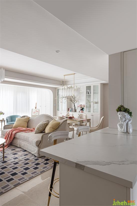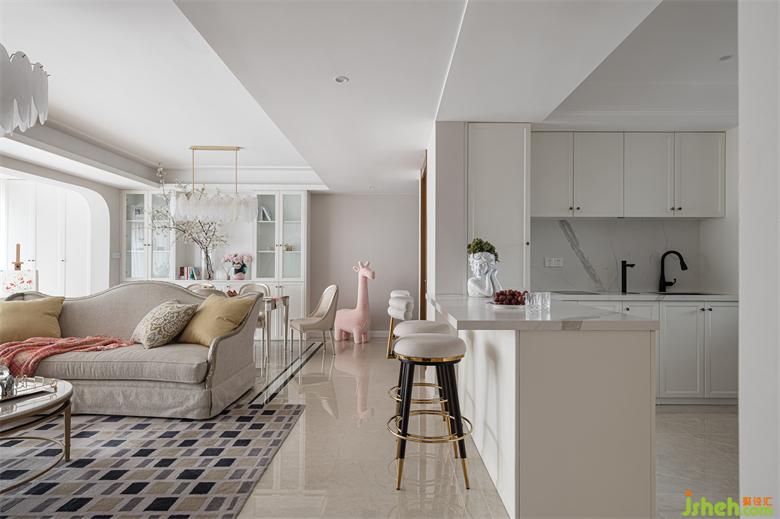成都遠洋萬和公館裝修設計師根據(jù)業(yè)主的日常所需,設置了一個十分便利的吧臺,白色的臺面簡潔干凈,利落的線條極富理性。整個吧臺既是空間的中轉場,又是女主人獨酌或者與朋友暢飲的休閑放松場所。