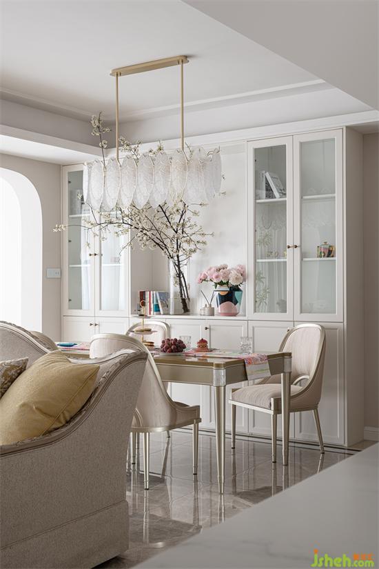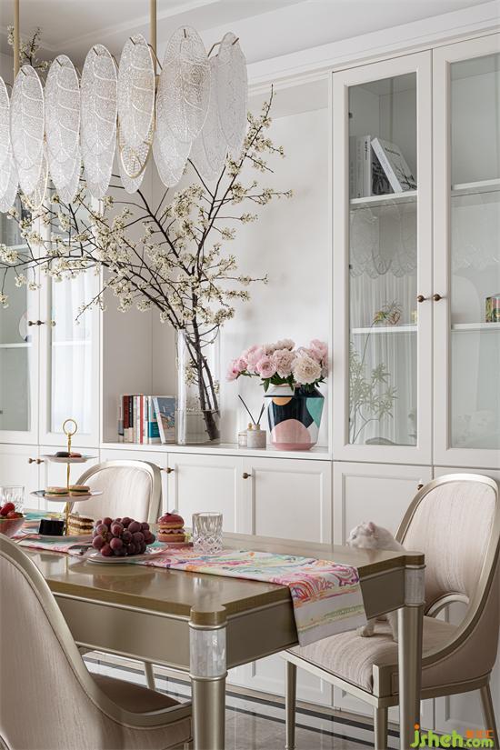 餐廳的布置依舊延續(xù)整個空間的浪漫格調(diào),成都遠洋萬和公館裝修設計以弧形元素增加雅致感,選用與客廳相呼應的花瓣形吊燈,脈絡分明,頗具精雅質感。