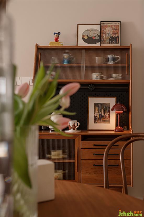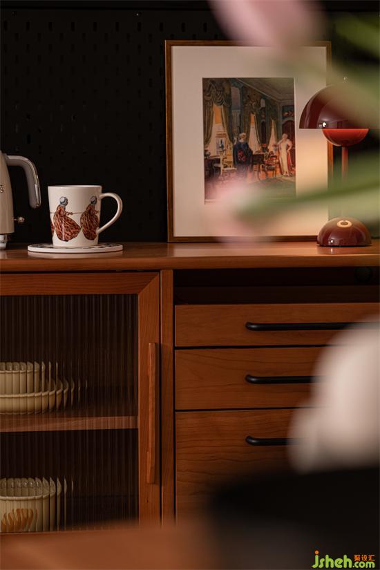 獨(dú)具復(fù)古情調(diào)的餐邊柜,工于細(xì)節(jié),不僅外觀雅致,更具備了強(qiáng)大的收納功能,成都家裝設(shè)計(jì)用來(lái)放置日常使用的茶具、杯盤、碗碟,再擺上幾幅格調(diào)清雅的畫作,文藝氣息撲面而來(lái)。