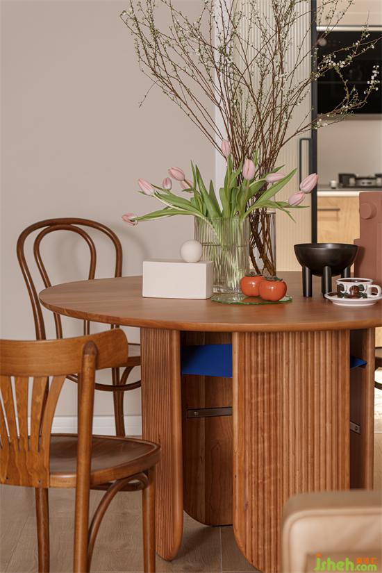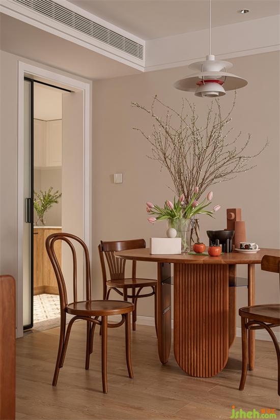 餐廳延續(xù)空間的木質(zhì)元素,成都家裝設(shè)計(jì)獨(dú)特的餐桌,底部圍繞有弧形桌腿,上面飾有細(xì)密紋路,做工考究,獨(dú)特之余,又頗有質(zhì)感,靠背餐椅的弧形線條與之呼應(yīng),自然優(yōu)雅。