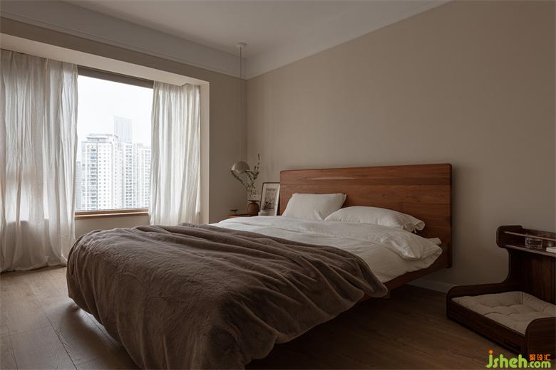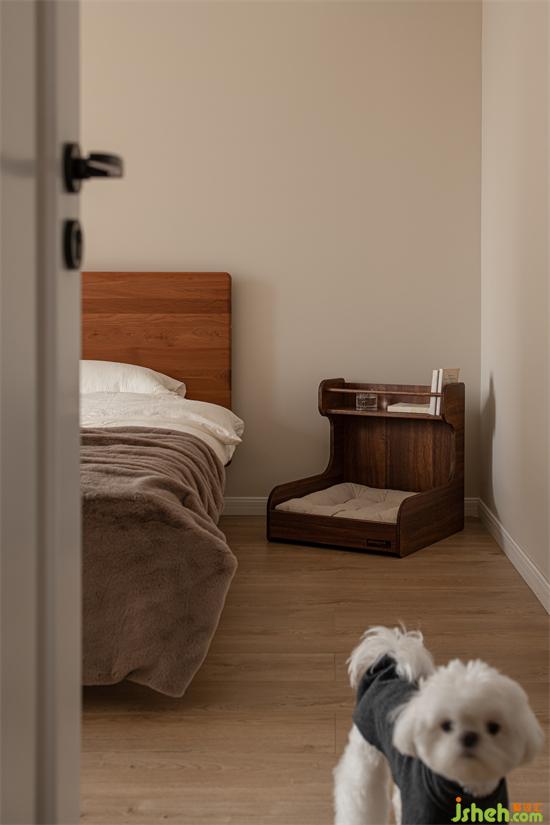 主臥采光通風(fēng)良好,選用沉穩(wěn)的木色,營(yíng)造舒適安靜的休憩氛圍,同時(shí),也與整個(gè)家的自然氣質(zhì)相呼應(yīng)。成都家裝設(shè)計(jì)將狗狗木床放置在室內(nèi),方便平時(shí)照料。