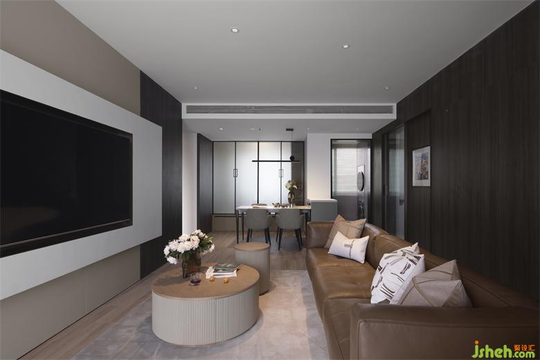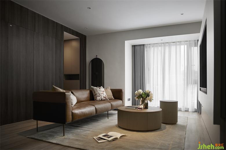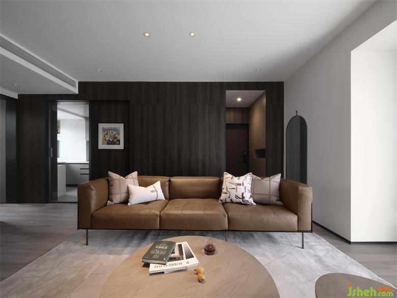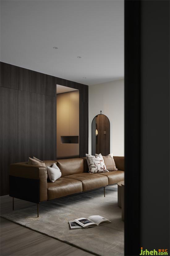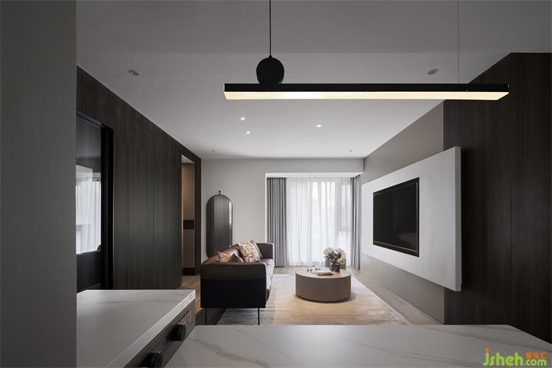 客餐廳一體的格局,開闊通透,極具縱深感,給人帶來視覺上的放松。深色木質(zhì)墻面,為空間奠定了沉穩(wěn)克制、自然溫潤的基調(diào)。