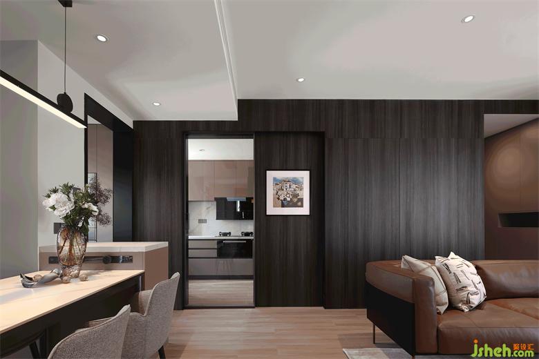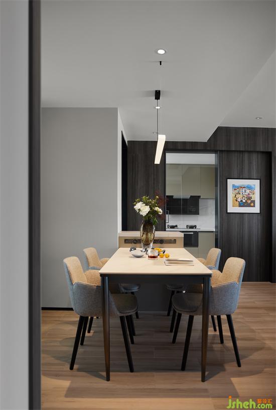 餐廳與客衛(wèi)之間設(shè)有隱形門,關(guān)閉不用時(shí),展示出整面完整的墻面,成都新綠季節(jié)家裝設(shè)計(jì)讓整個(gè)空間看起來(lái)更加和諧統(tǒng)一。