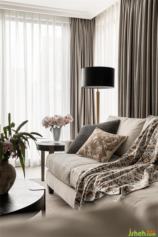 寬大舒適的白色沙發(fā),搭配棕色柔軟的紋飾靠枕和蓬松的羊毛地毯,和諧美觀。邊幾上的粉色花束帶來些許的浪漫情調(diào)。
