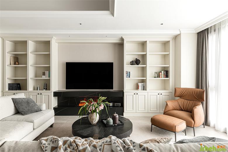 電視背景墻簡潔精巧,下方的壁爐作為空間中的視覺焦點,給空間增添融融暖意。