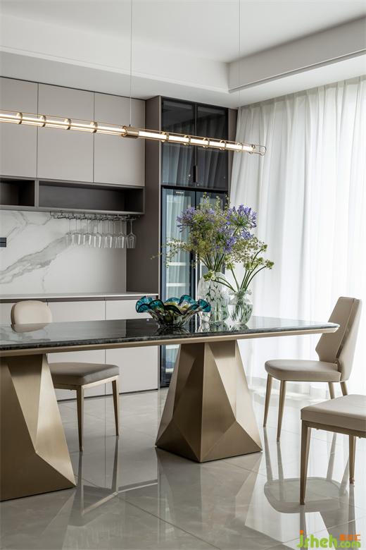 餐廳延續(xù)空間的主色調(diào),餐桌別具設(shè)計個性,黑色理石桌面與黃銅相結(jié)合,加上黃銅桌腿別出心裁的厚重造型,家裝設(shè)計都讓餐廳充滿了現(xiàn)代時尚的典雅氛圍。