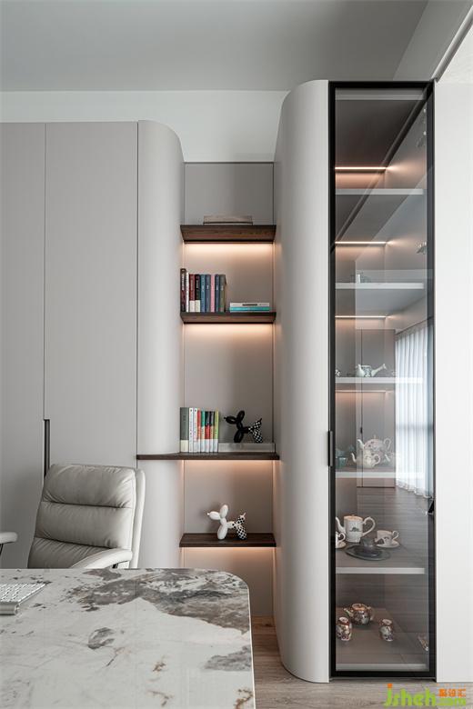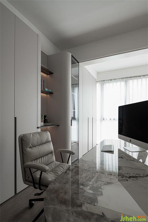 書房以淡雅的灰色作為主色調(diào),給人一種溫暖平靜之感,溫潤的弧度更增造型之美。寬大舒適的書桌放置在房間中央,加上一把柔軟的靠背椅,為人專注的工作學(xué)習(xí)提供了理想的場所。