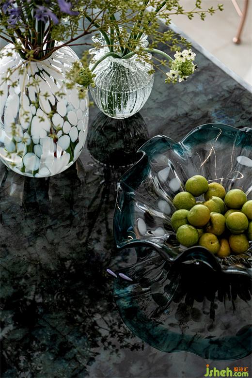 紫色的花束與綠色的青李,在視覺上給人一種清爽之感,豐富的色彩與香氣讓空間變得輕松愉悅起來。