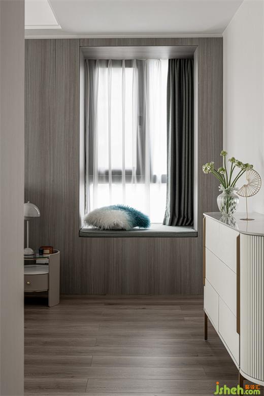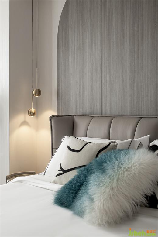 主臥空間明亮開(kāi)敞,讓人步入其中即有一種視覺(jué)上的放松感。主臥的背景墻采用木質(zhì)弧形設(shè)計(jì),紋理細(xì)膩,頗具質(zhì)感。