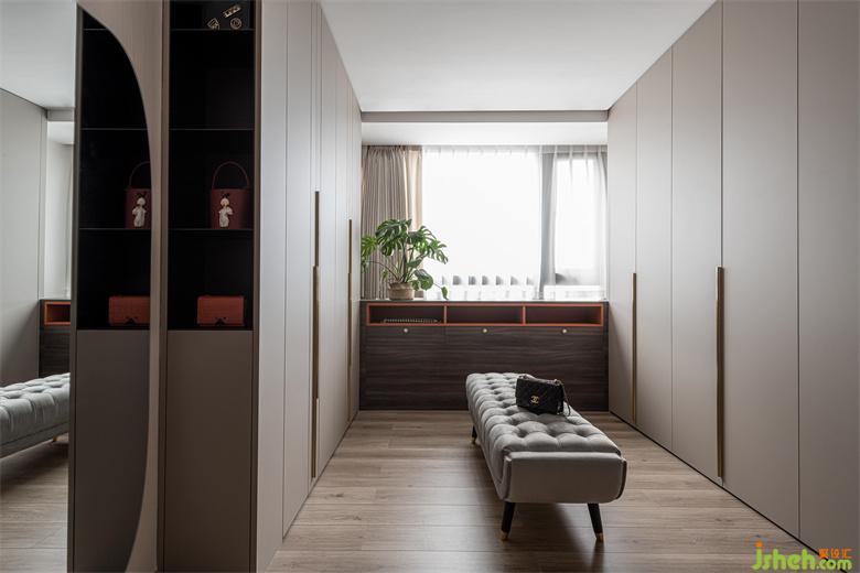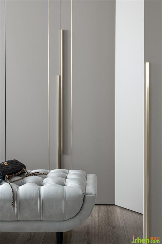衣帽間遵循著極簡(jiǎn)設(shè)計(jì)原則,家裝設(shè)計(jì)將收納利用到極致,整潔有序,金色的把手點(diǎn)綴既呼應(yīng)了空間的輕奢調(diào)性,又極具美觀性。