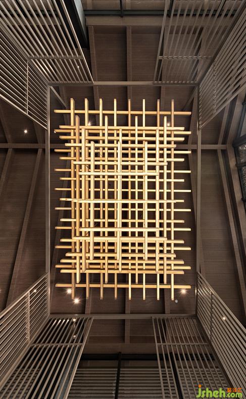 The light installation of roof is based on dougong, which inevitably attracts the attention of the public, this is an artistic device from traditional architectural elements, the illuminant sends out charming light through acrylic.