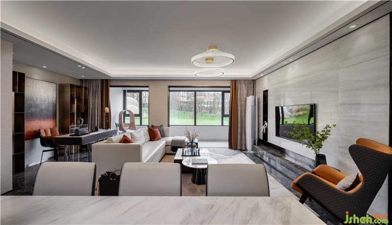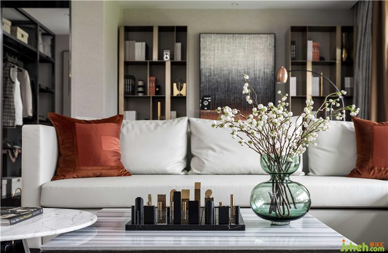 金屬與大理石是很好的藝術(shù)伙伴,它們總是能讓空間的品質(zhì)和價(jià)值提升一個(gè)層面。如果白色是主大調(diào),那么咖色就是小音階,金色勾略出白色的優(yōu)雅,宛如置身于維也納伴著華爾茲的步伐,優(yōu)雅迷人。樣板房設(shè)計(jì)