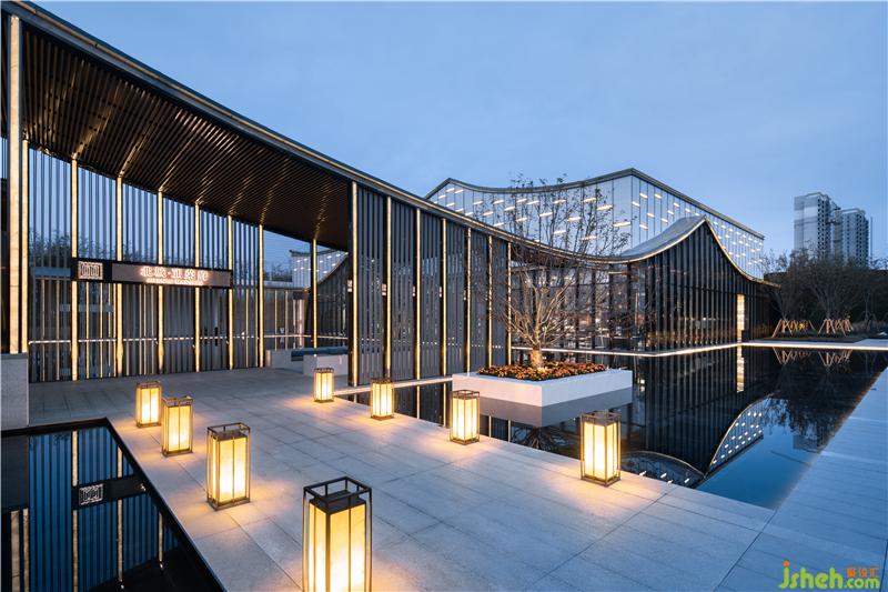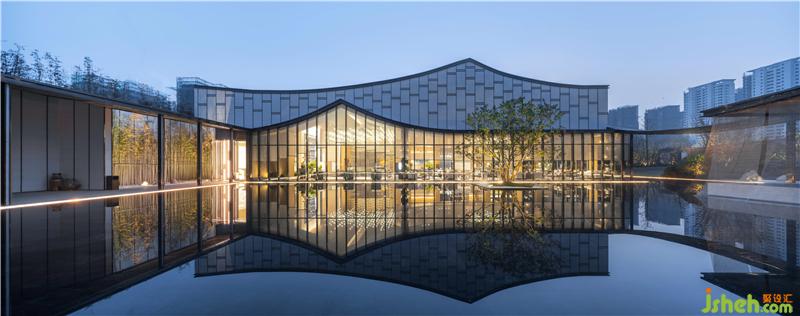 設(shè)計(jì)師從徽派建筑的瓦當(dāng)這個(gè)傳統(tǒng)的建筑構(gòu)件中提煉出其形,結(jié)合了建筑的人字形設(shè)計(jì),采取了比較柔和的連續(xù)弧形‘人’字形屋頂結(jié)構(gòu),形成一個(gè)整體。