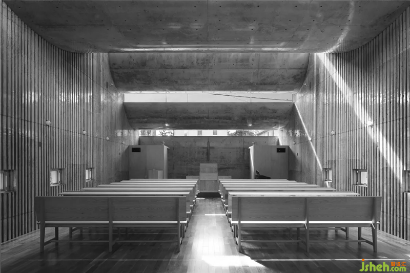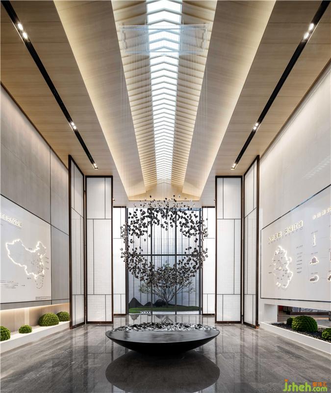前廳屋頂?shù)脑O(shè)計(jì)呼應(yīng)建筑的立意,向上的形態(tài)引喻人們內(nèi)心深處,與生俱來(lái)對(duì)于天空的向往。端頭的天井及景觀設(shè)計(jì)與室內(nèi)的天花造型、屏風(fēng)圍合,共同形成一個(gè)極具儀式感的空間,引發(fā)人們對(duì)自然與天空向往的同時(shí),向東方傳統(tǒng)人居思想致敬。
