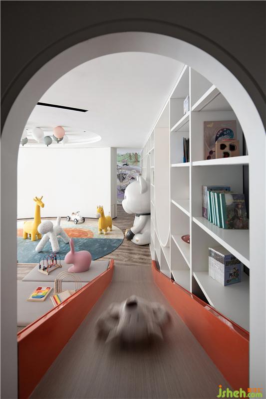 設計者對購房者產生的共情,基于能進入他人的情境,感受他人的情緒,才能最終引發(fā)共鳴?;诮ㄖw本身的格局,設計者從成人考慮的安全性、兒童使用的體驗感雙重需求出發(fā),既從動線和材質上滿足安全性,讓兒童處于家長的視線范圍之內,并以旭輝集團專為兒童區(qū)打造的小熊IP為主題,為孩童們打造了一處童話樂園,也讓成人心生對于美好生活的憧憬。