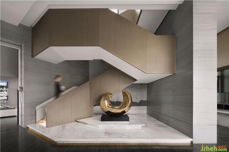 盤旋空間的樓梯,大理石堆砌與木飾面辯證融合,干凈利索的塊面關(guān)系中注重結(jié)構(gòu)性的表達(dá),整體空間和諧統(tǒng)一。
