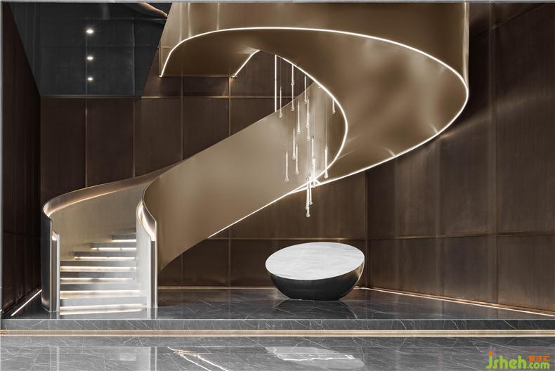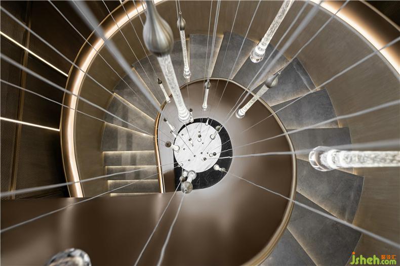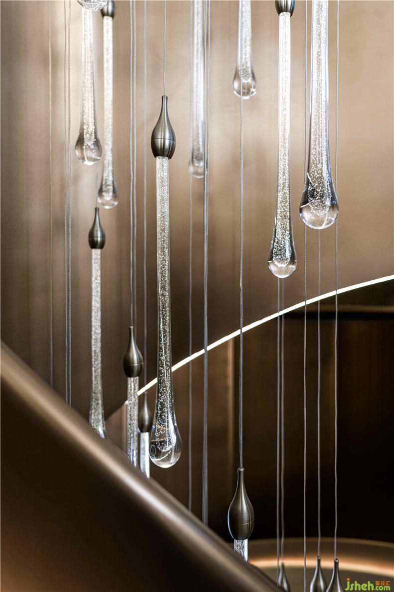 線(xiàn)在物理世界是以邊界的形式存在的,而感官世界里線(xiàn)是一種尺度的認(rèn)知,它的意義不來(lái)自于自身,而來(lái)自如何被形容。沿著墻、循著光,按著動(dòng)線(xiàn)進(jìn)入樓梯拾級(jí)而上金色綢緞自然回旋的樓梯,室內(nèi)設(shè)計(jì)師可靜觀可動(dòng)賞,錯(cuò)落式的燈光裝置如雨幕降落,底部鏡面裝置反射燈光出如夢(mèng)如幻的,俯瞰光影舞動(dòng)。