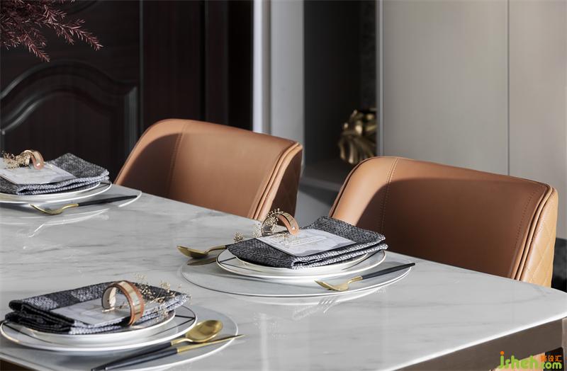 大理石餐桌、棕色皮質(zhì)餐椅與客廳配色遙相呼應(yīng),強(qiáng)化了室內(nèi)空間的統(tǒng)一感與精致感。