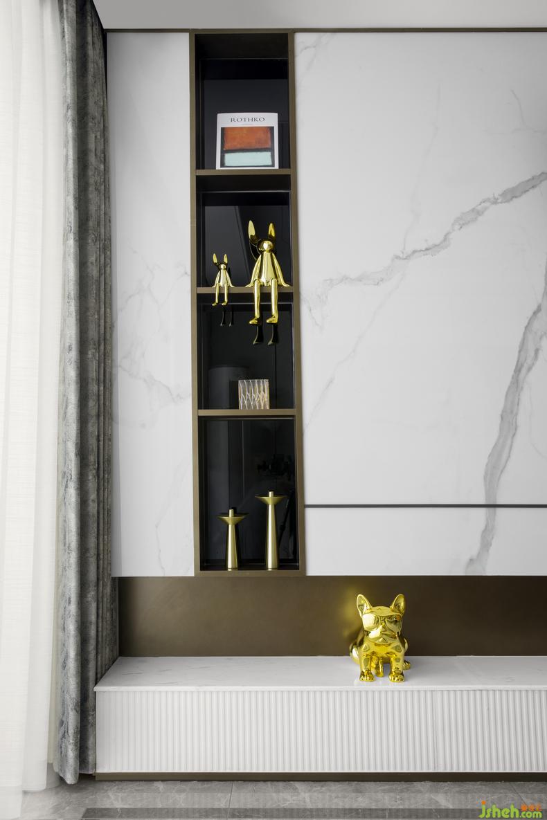 寥寥幾件金屬擺件,就能讓空間色彩對(duì)比更加鮮明。亦能從側(cè)面表現(xiàn)業(yè)主年輕而活潑的審美。樣板房設(shè)計(jì)