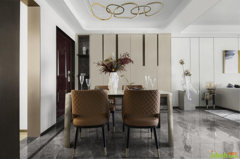 大理石餐桌、棕色皮質(zhì)餐椅與客廳配色遙相呼應(yīng),強(qiáng)化了室內(nèi)空間的統(tǒng)一感與精致感。