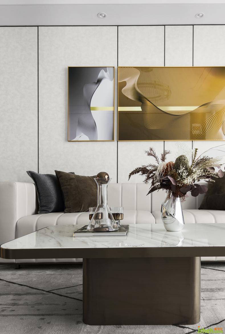 素雅輕奢的皮質(zhì)沙發(fā)、光澤柔和的大理石臺(tái)面、現(xiàn)代風(fēng)格濃厚的掛畫,串聯(lián)描摹出現(xiàn)代精致客廳空間的準(zhǔn)確畫像。