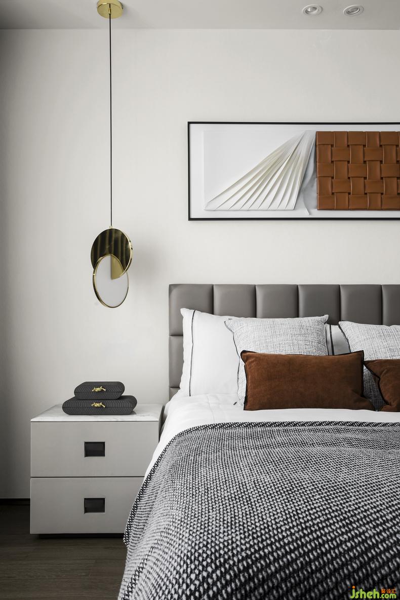 床頭掛畫的皮質(zhì)光澤與紙質(zhì)纖維的紋理,樣板房設(shè)計(jì)與亞克力材質(zhì)的床頭燈共同表現(xiàn)出豐富的層次。