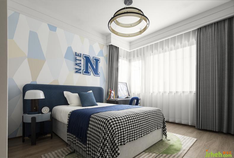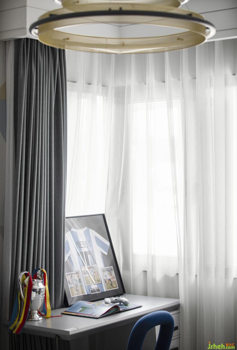 兒童房的設(shè)計(jì),運(yùn)用清爽的藍(lán)色與各式各樣關(guān)于足球的擺件,草綠色的地毯就如足球場(chǎng)上的草地。