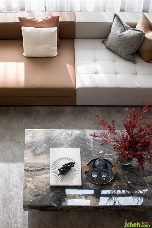 舒雅的高級灰調(diào)與咖色搭配,間或點綴的裝飾圖案及金屬線條元素拉伸出豐富的空間層次。躍然眼簾的客廳空間以一種高于生活的姿態(tài),由內(nèi)而外散發(fā)出高級質(zhì)感,表達(dá)著主人對極致優(yōu)雅的追求。