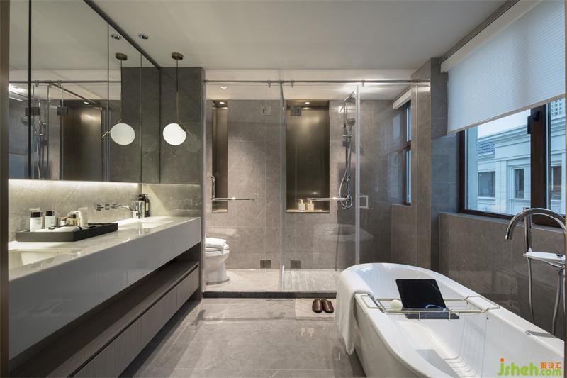 空間搭配上,浴室也絕不含糊。高級(jí)大氣的沉穩(wěn)灰色系,鏡面與巖板相嵌,暖黃色燈具打破灰調(diào)沉悶,讓空間展示精致摩登與沉穩(wěn)經(jīng)典的低調(diào)氣質(zhì)。
