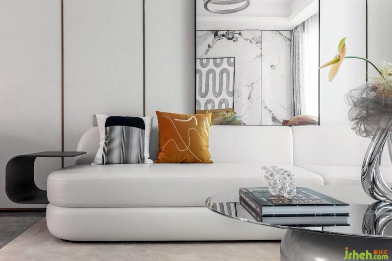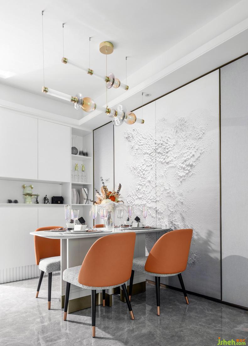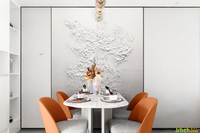整體空間以靜謐淺色調(diào)主色調(diào),配以優(yōu)雅和諧的橘黃色,加以金屬色點綴;樣板房設(shè)計個性和時尚傳達至每一處,讓空間有著多維藝術(shù)視角的生活感觸。