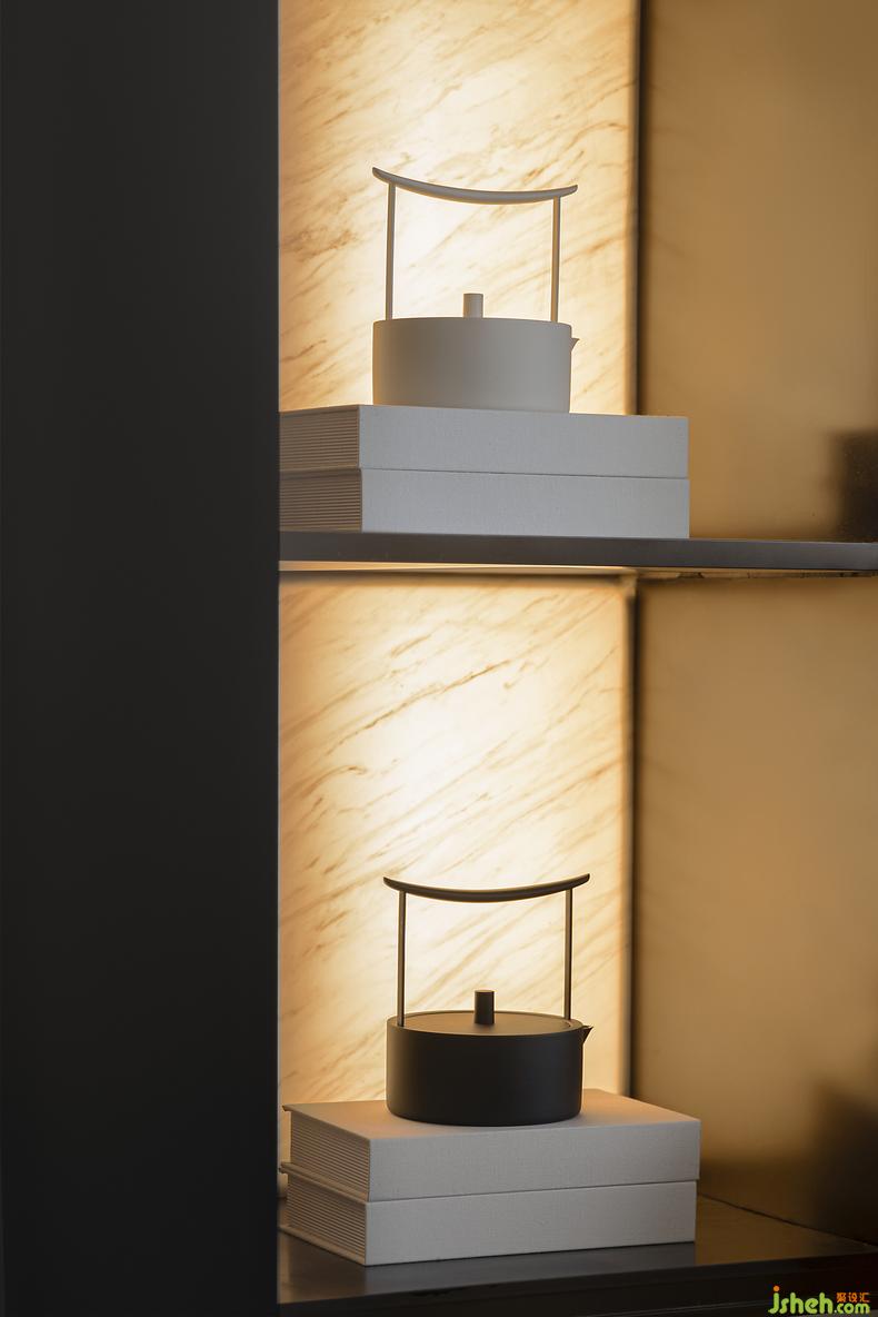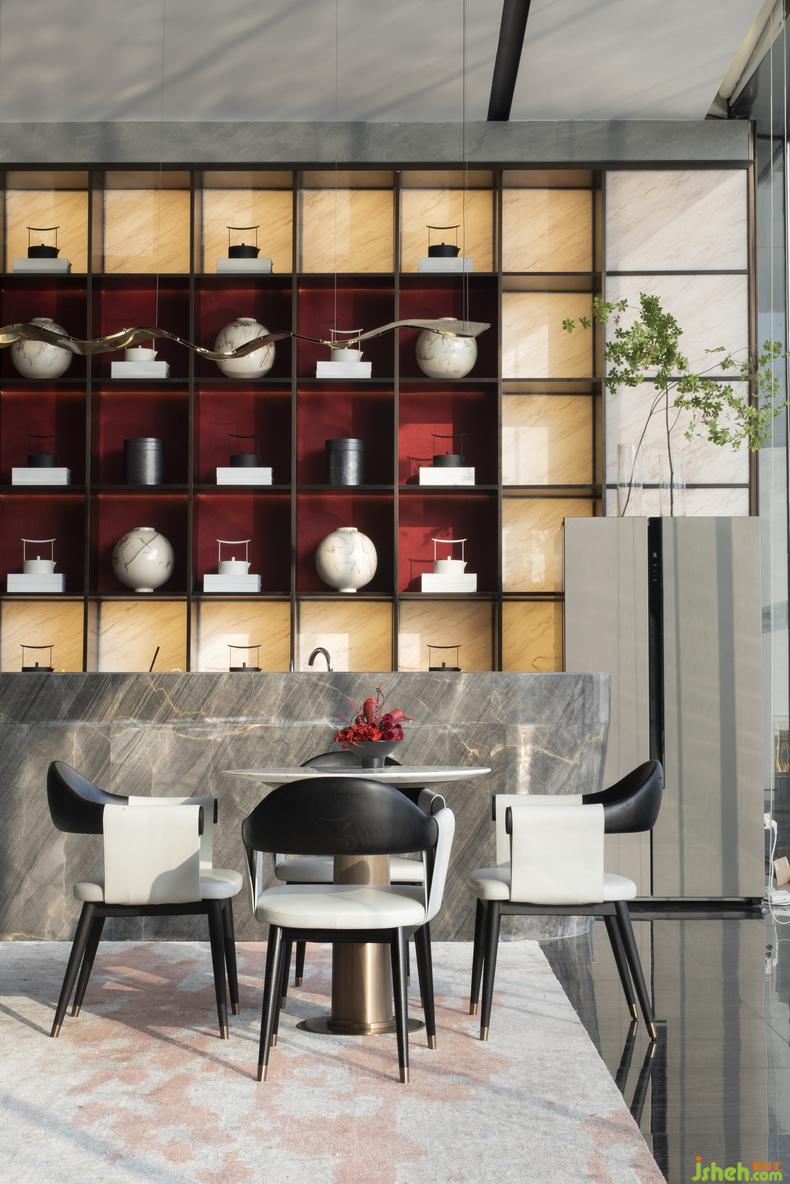 來到空間末端的深度洽談區(qū),深色墻面安靜有力地坐落在尾端,透過錯落有致的光影對比,售樓處設(shè)計營造更加私密的互動空間,于感官轉(zhuǎn)化人們對空間場域的體驗。