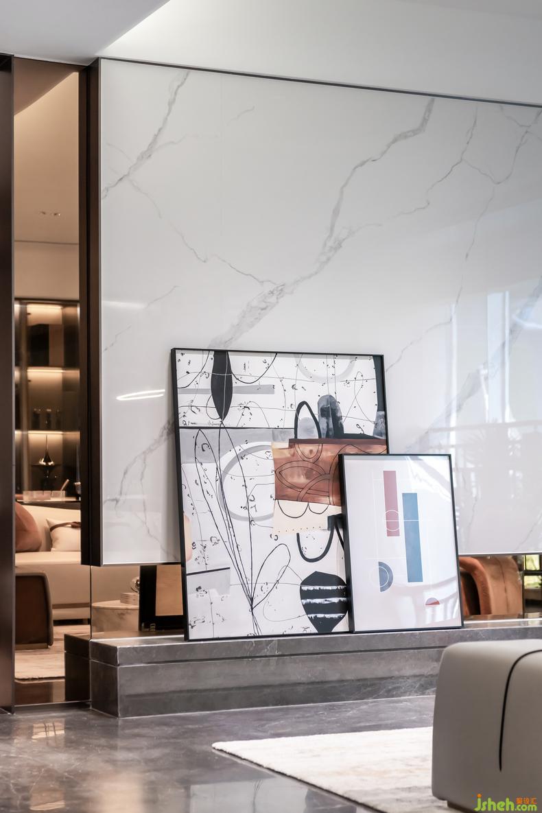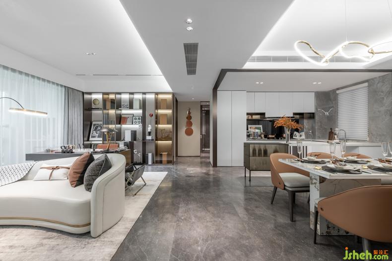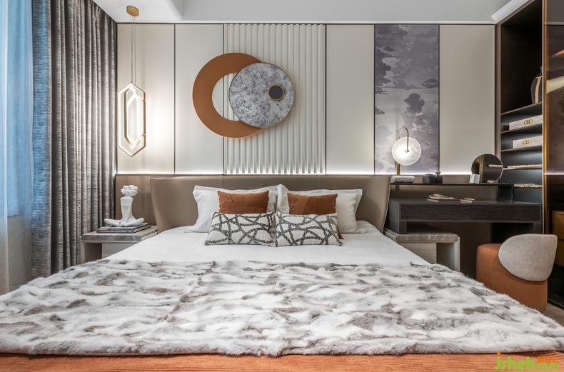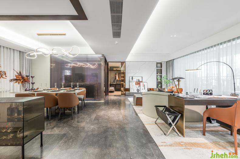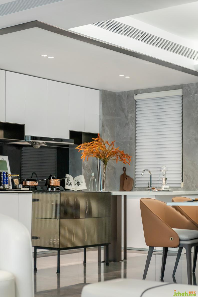 空間整體以灰白色調(diào)為主,以素色為基調(diào),高質(zhì)感的選材加以高級灰以及灰橙色點綴。