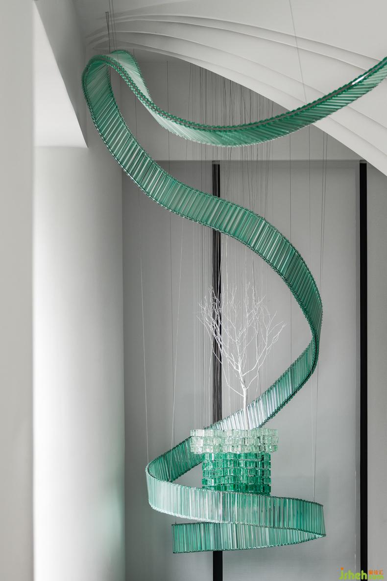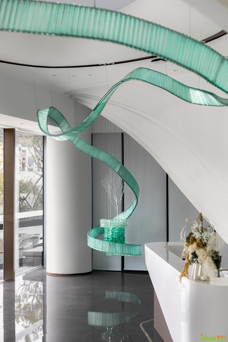 接待前廳是空間的第一印象,從天垂降的藝術(shù)天花裝置以輕盈的形態(tài),貫穿整個(gè)空間,與城市中蜿蜒飄然的柳江相呼應(yīng)。以水為脈,以樹為神,動(dòng)態(tài)回歸到靜物,一株枝葉紛繁的樹立于中心,小小一隅,囊括了自然的靜美與崢嶸。于一水一木中營造“寄情于山水之間”的美好生活方式。